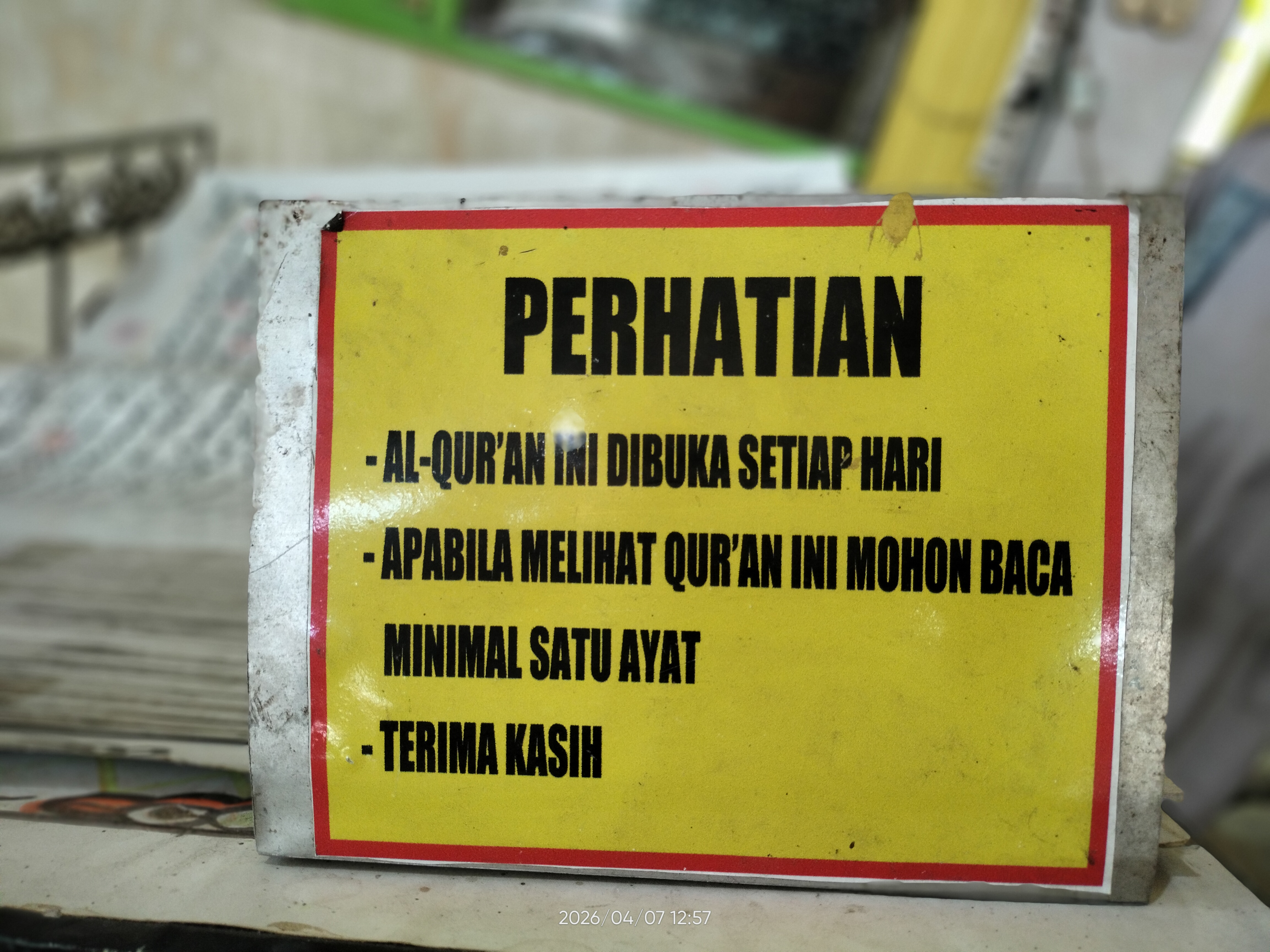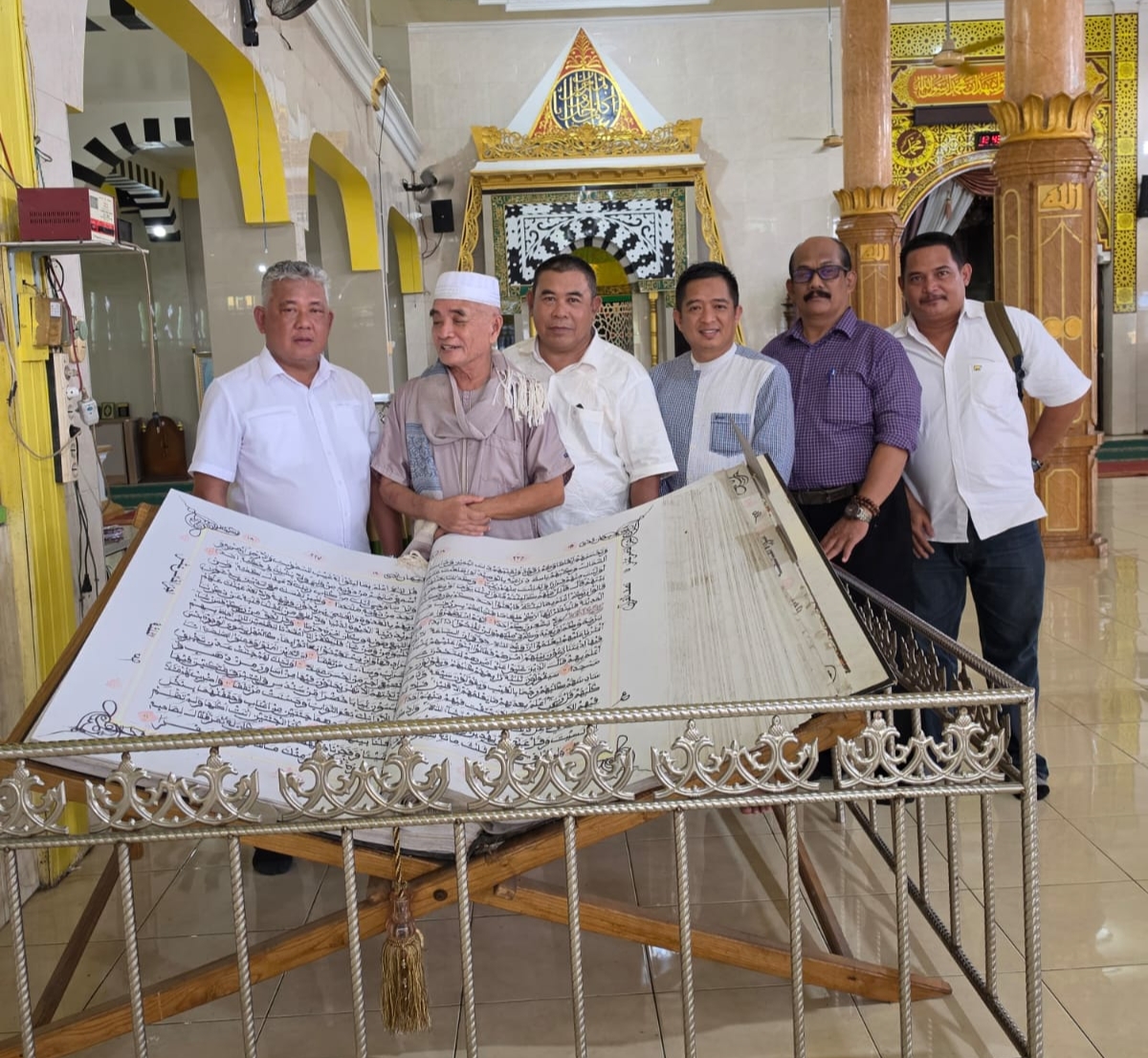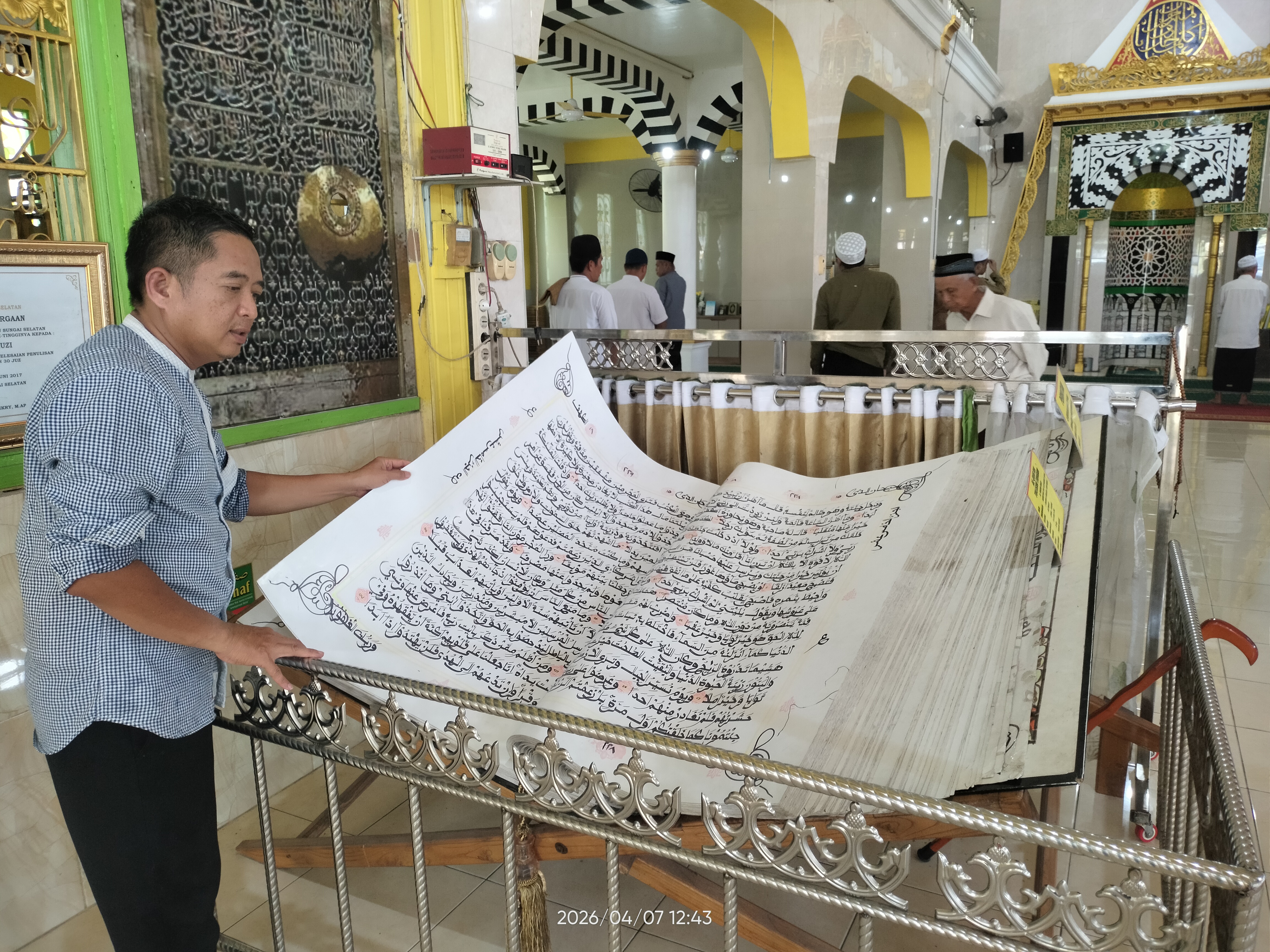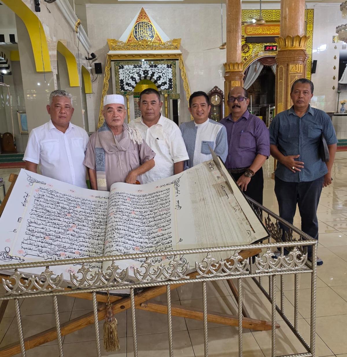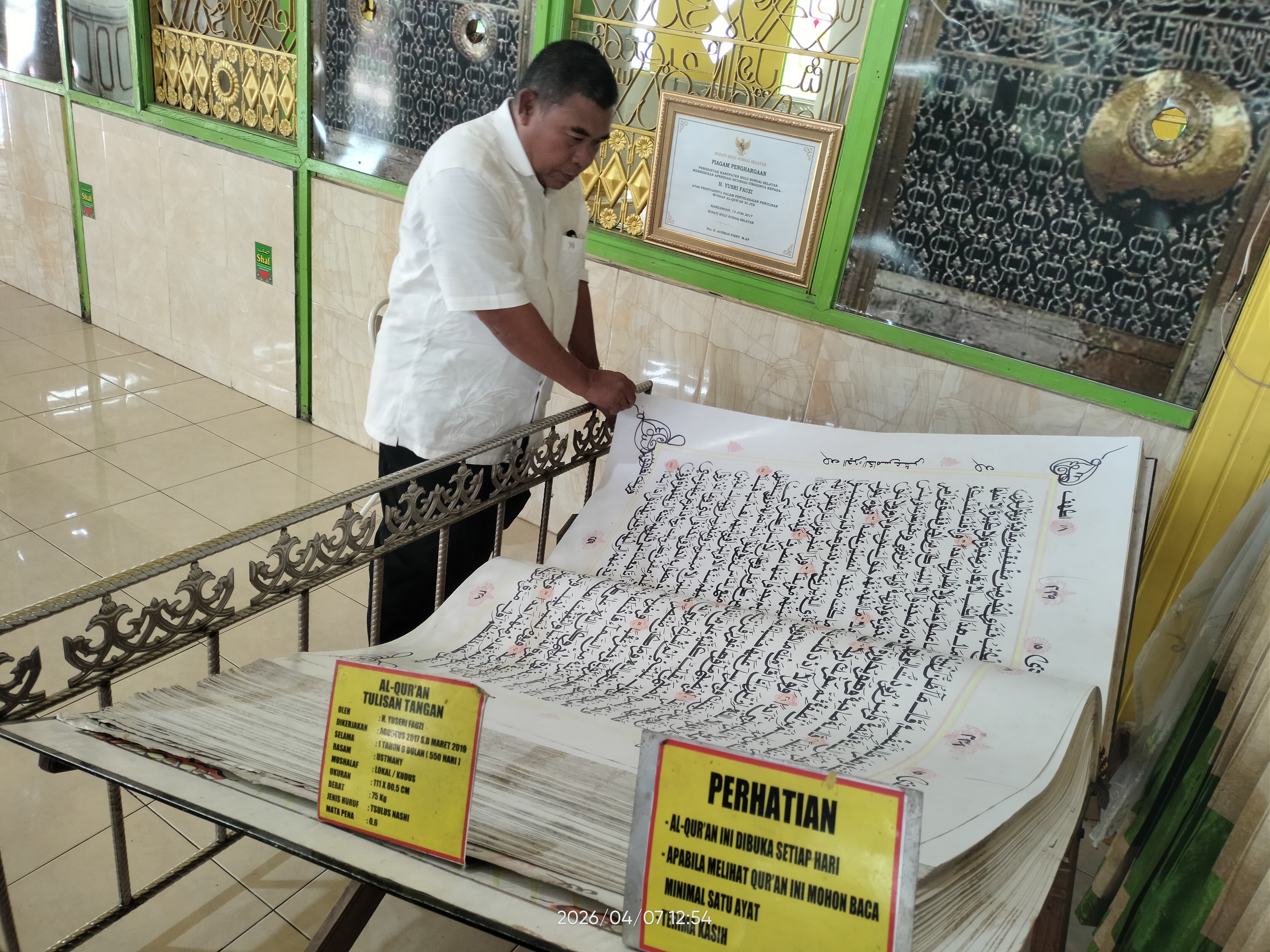 Ditemui iloenxnews.com bersama Pembina, Ketua Umum dan jajaran Dewan Pimpinan Pusat (DPP) Forum Kerukunan dan Pemerhati Warga Kalimantan (FKPWK) Selasa, (7/4/2026) ba’da Sholat Dzuhur berjamaah di masjid tersebut, Yusri menceritakan bagaimana menyelesaikan 3 mushaf itu. Pertama, ditulis pada 2015, dengan ukuran 90×60 sentimeter persegi dengan berat 45 kilogram.