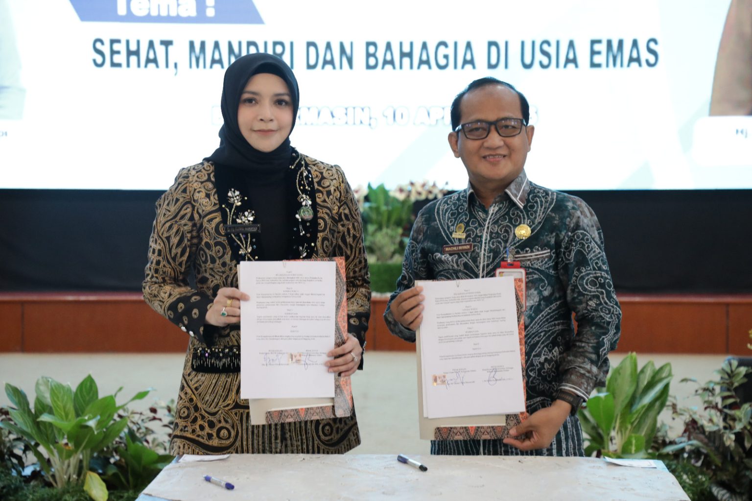 Ketua Badan Kerjasama Organisasi Wanita (BKOW) Provinsi Kalimantan Selatan (Kalsel) drg. Ellyana Trisya Hasnuryadi (kiri) foto bersama bersama Wakil Ketua II Pengurus IKA UNAIR Kalimantan Selatan Cak Dr Machli Riyadi,S.H,M.H,C.M.C yang juga Kepala Dinas Koperasi Usaha Mikro dan Tenaga Kerja Kota Banjarmasin, usai penandatangan kerjasama.