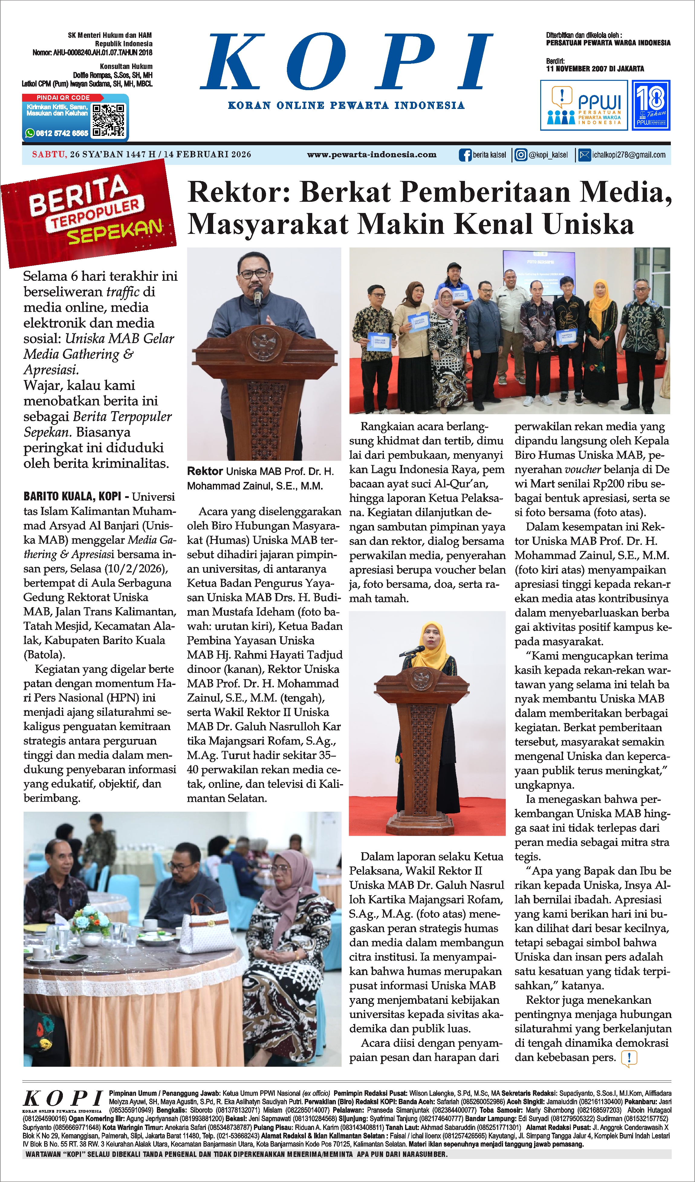 Pendidikan HOT NEWS: Zainul Resmi Profesor April 2, 2026April 2, 20261 min read admin Dr. Afif Khalid, S.HI., S.H., M.H., Dekan Fakultas Hukum Universitas Islam Kalimantan Muhammad Arsyad Al Banjari (Uniska MAB) Periode 2024-2029 Share Facebook Twitter Pinterest Linkedin