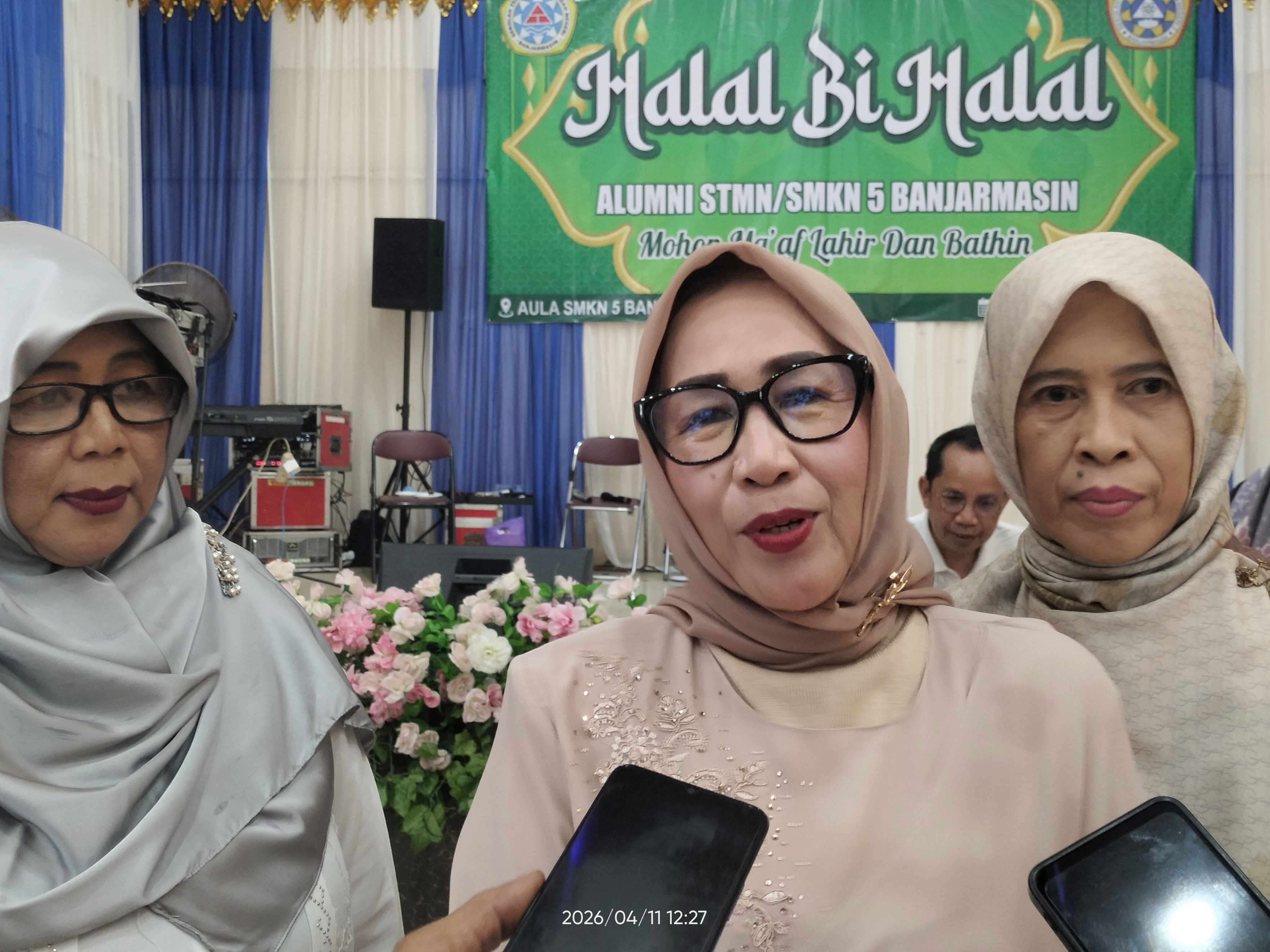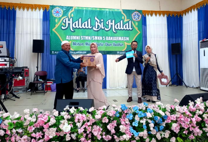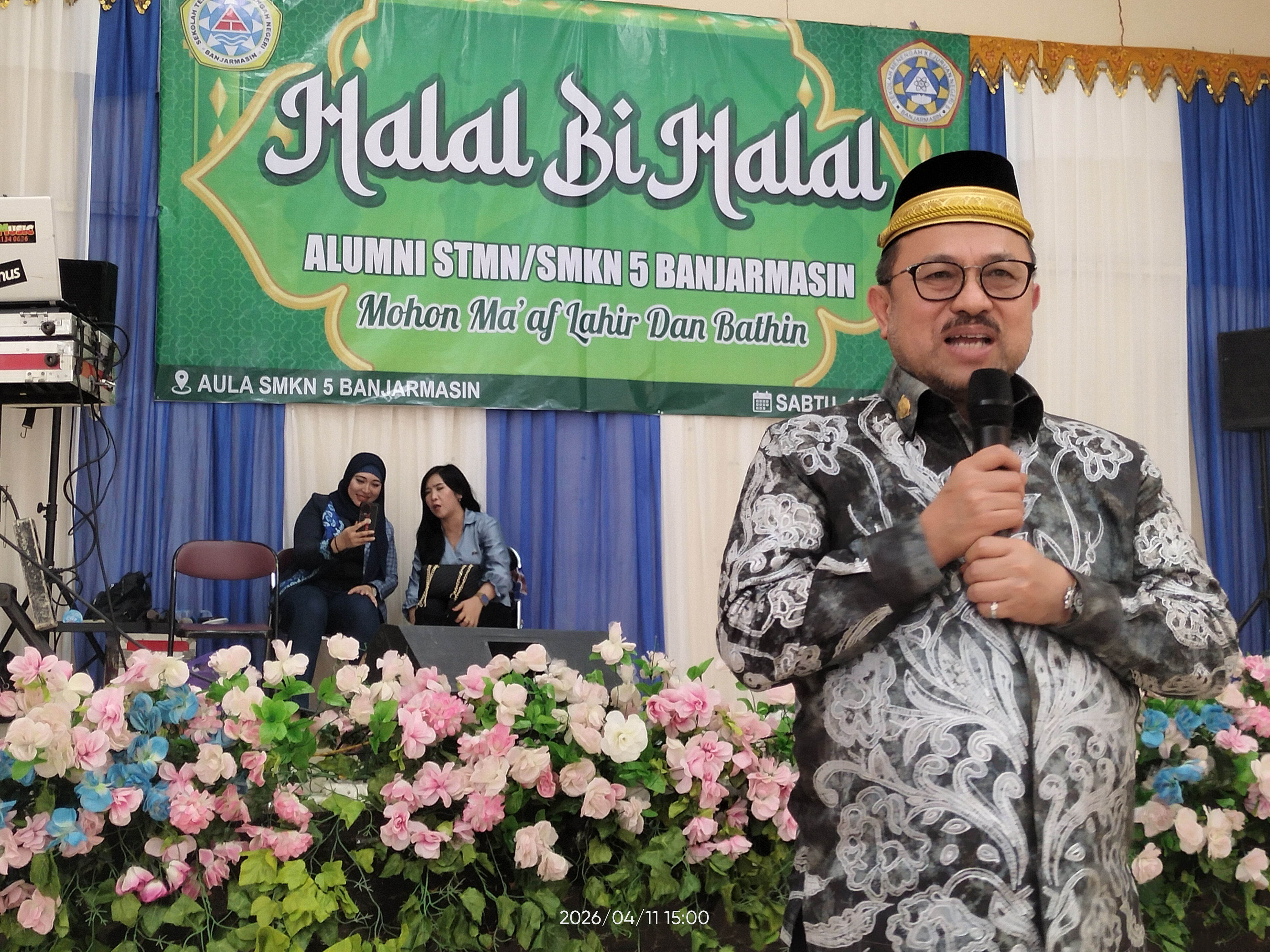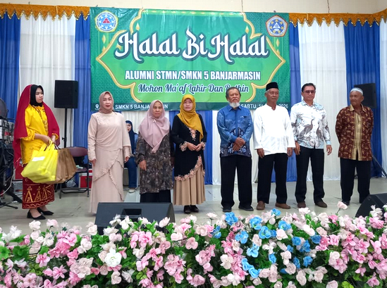 Banjarmasin, iloenxnews.com || Alumni Sekolah Teknologi Menengah Negeri (STMN) / Sekolah Menengah Kejuruan Negeri (SMKN) 5 Banjarmasin menggelar Halal Bi Halal dengan para alumni lintas angkatan rentang dari 1977 hingga 1995 dan tenaga pendidik tak terkecuali yang sudah purna bakti, di Aula SMK Negeri 5, Jalan Mayjend Soetoyo S Nomor 330, Kelurahan Pelambuan, Kecamatan Banjarmasin Barat, Kota Banjarmasin, Kalimantan Selatan (Kalsel), Sabtu (11/4/2026) pagi hingga petang.