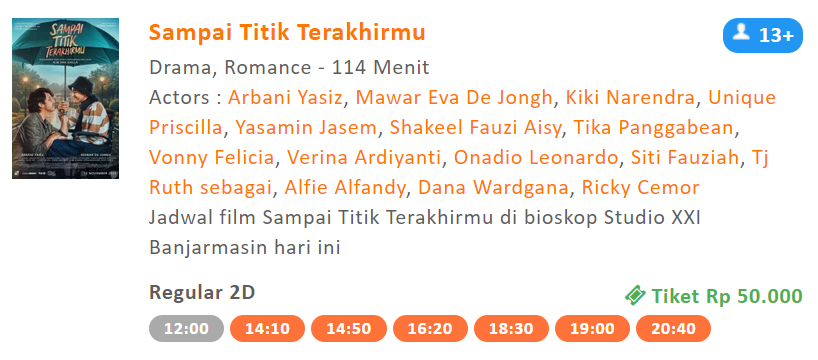 Sampai Titik Terakhirmu sudah tayang di seluruh bioskop Indonesia sejak Kamis (13/11/2025) hingga masih sampai hai rini Selasa (25/11/2025). Yuk, kita sama-sama nonton di Bioskop XXI Duta Mall Banjarmasin.