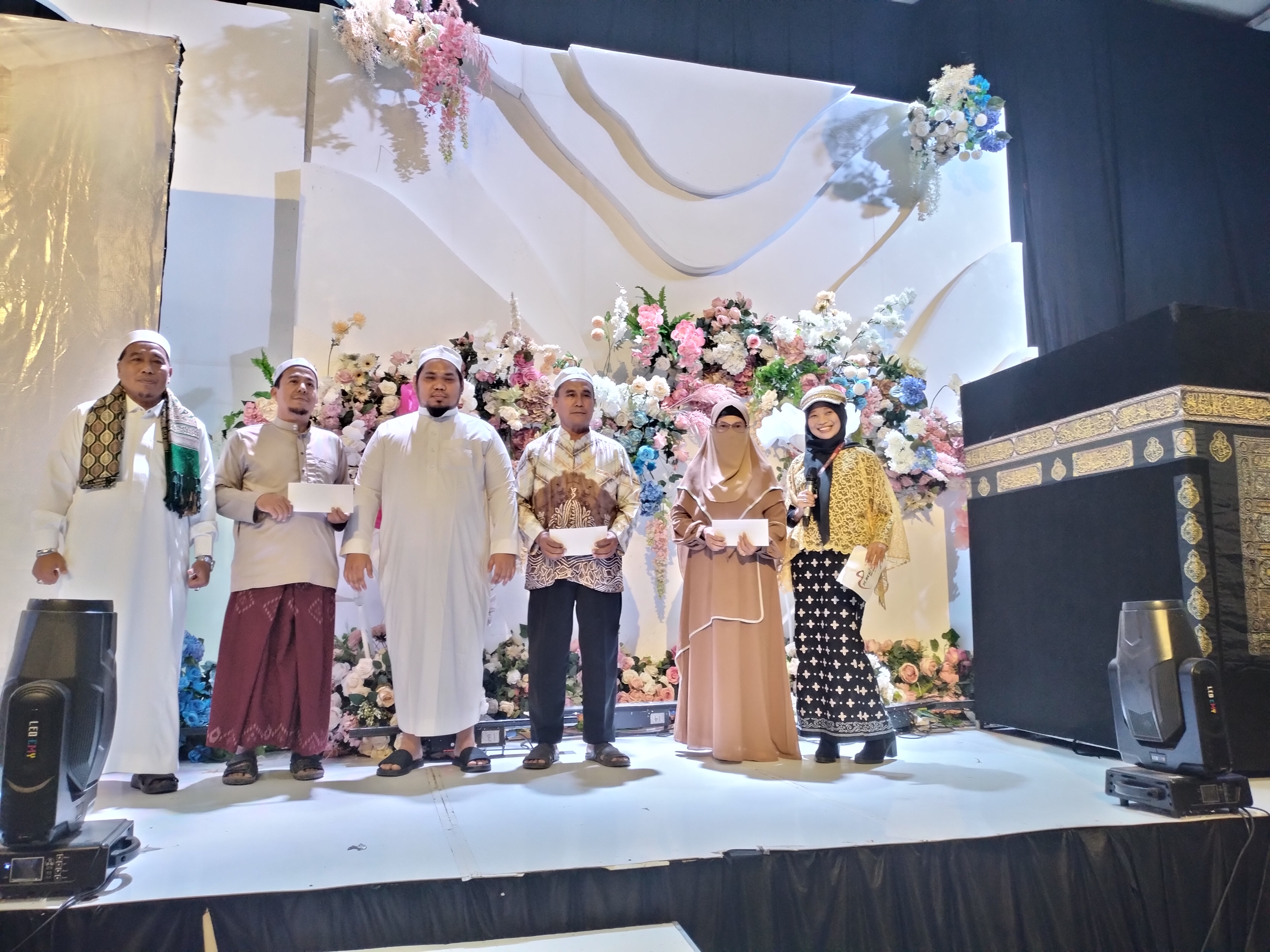 3 pemenang kuiz berfoto bersama Ustadz Irhami (ketiga dari kiri) dan Guru Yusuf Al-Banjari (paling kiri) dan MC Itay (paling kanan). (foto: ichal iloenx)